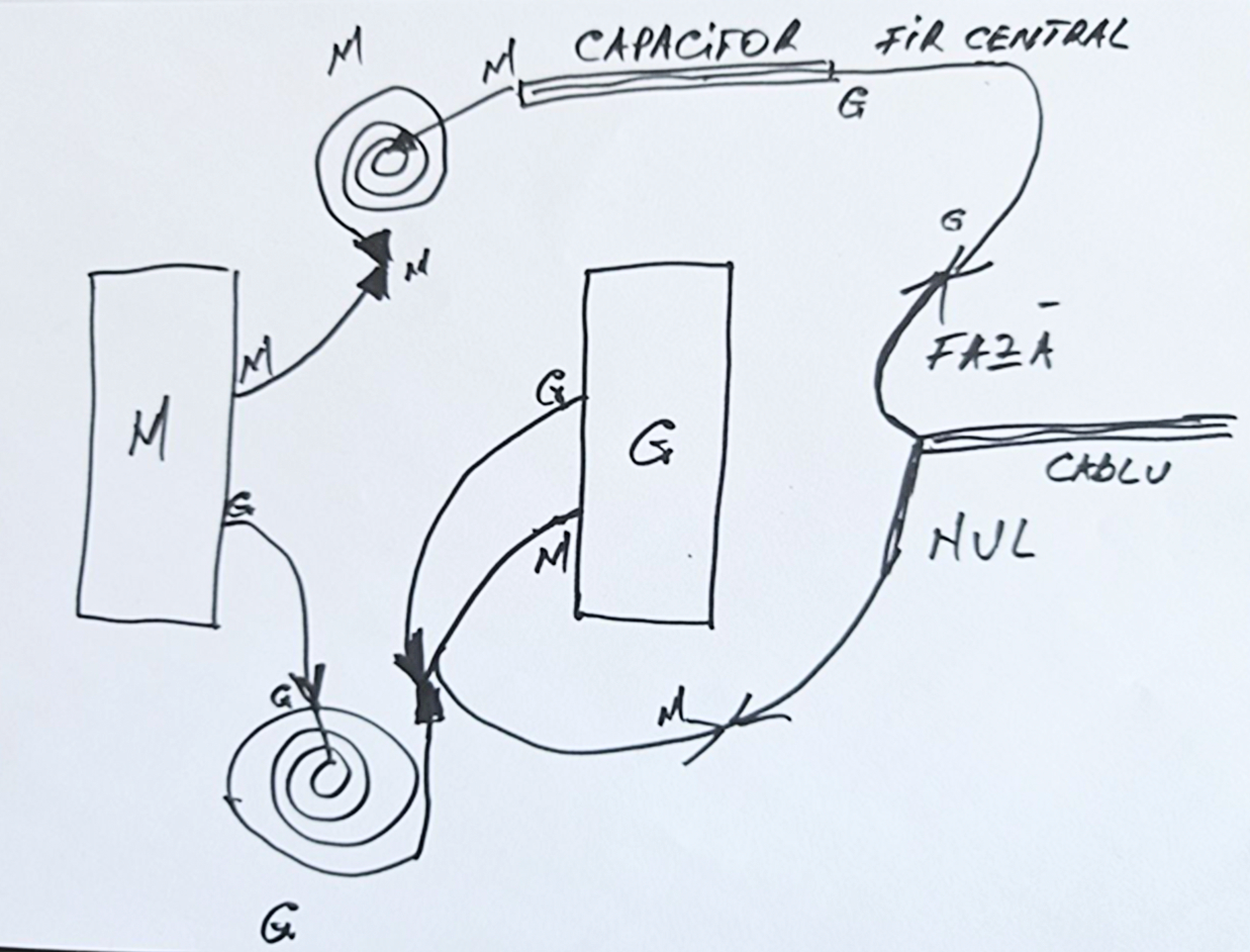 3. Capacitor Gravitational se leagă la Fază (culoare maro) pe sens de înfășurare Gravitational.